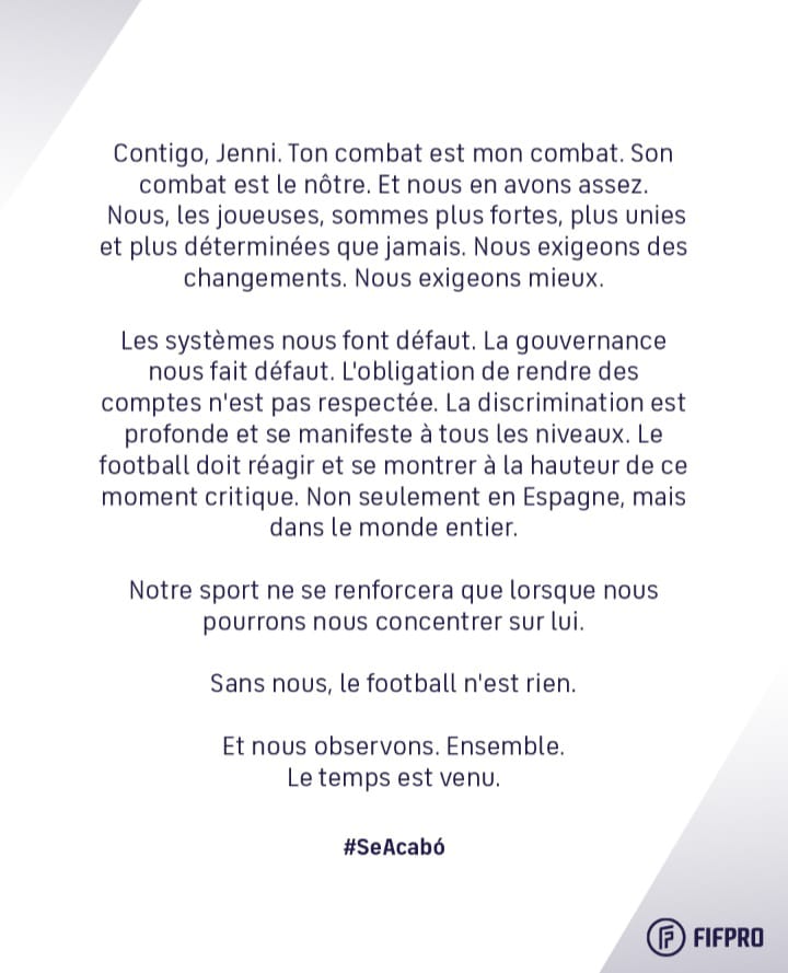 Nous avons pris connaissance cet après-midi du 1er Septembre 2023 à 15 GMT du message de solidarité publié par David Aganzo et la FIFPRO en soutien à Jenni Hermoso et aux joueurs espagnols. Nous partageons leurs préoccupations concernant les événements récents en Espagne et nous croyons fermement que ces problèmes reflètent des enjeux systémiques plus larges dans le football féminin.