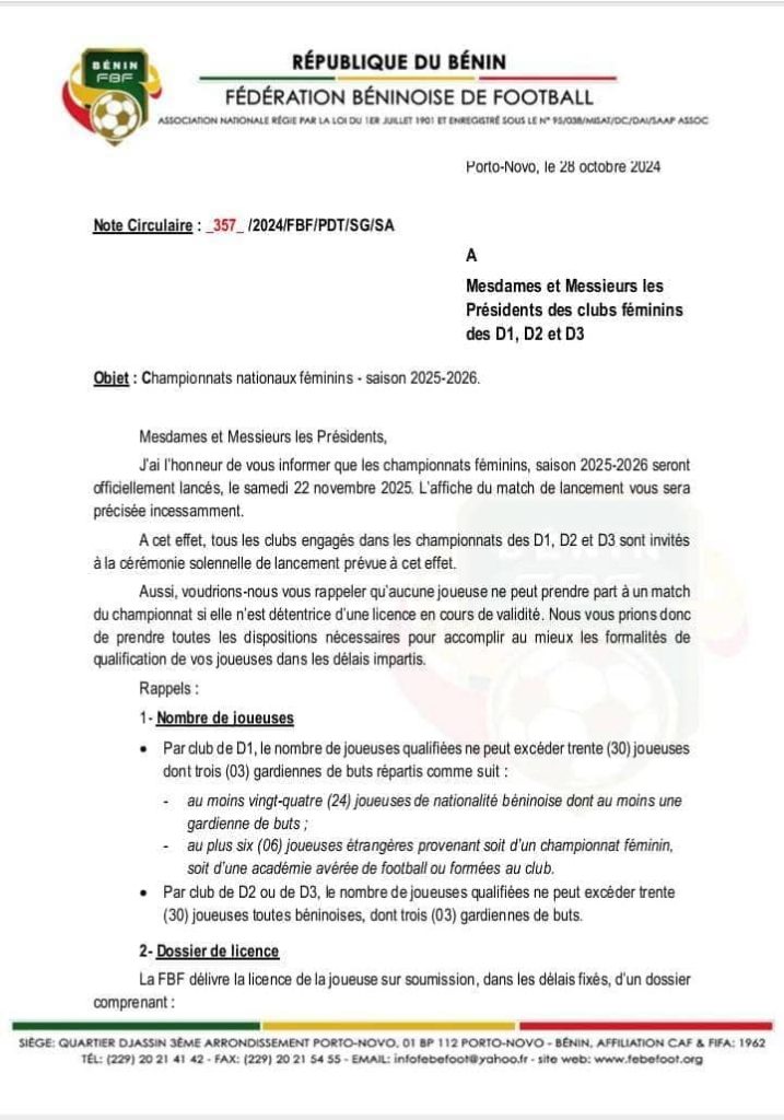 C’est à travers une correspondance datée du 28 octobre 2025 que le patron de l’administration de la FBF a tenu informer les présidents des clubs engagés dans les championnats Féminins de 1re, 2e et 3e divisions.