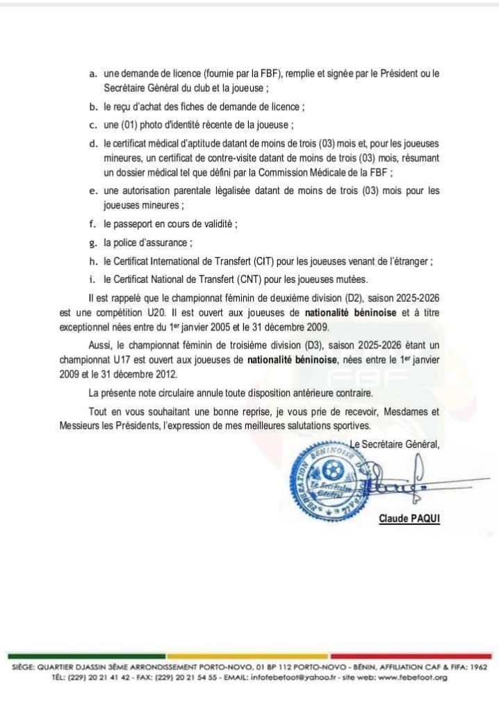 Enfin, la FBF a tenu à rappeler que la D2 et la D3 sont réservées aux joueuses U20 et U17 respectivement et uniquement de nationalité béninoise.